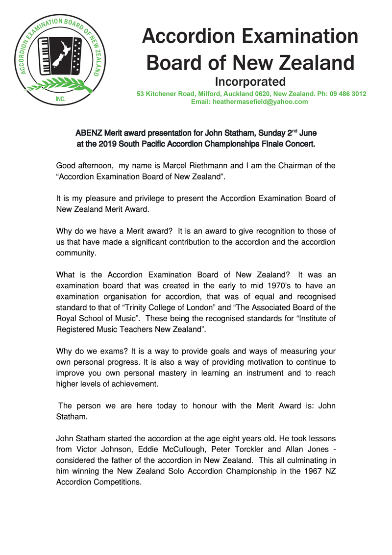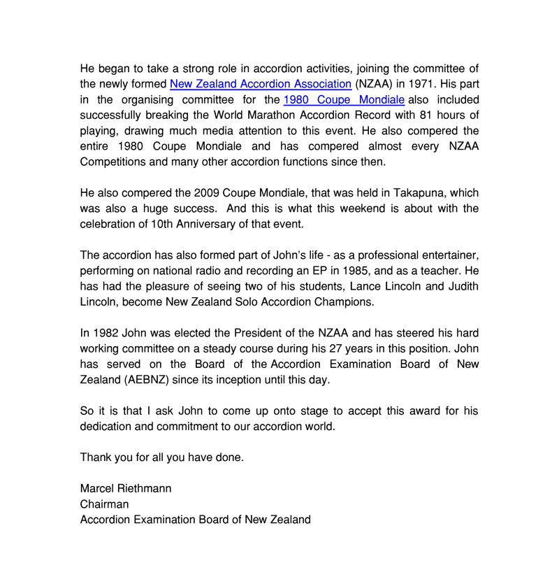 It is with pleasure the NZAA thanks John Statham for his years of dedication and commitment to the NZAA and to promoting and advancing the accordion in New Zealand for national and international events and hereby nominates him for the Confédération Internationale des Accordéonistes (CIA) Honored Friend of the Accordion Award.